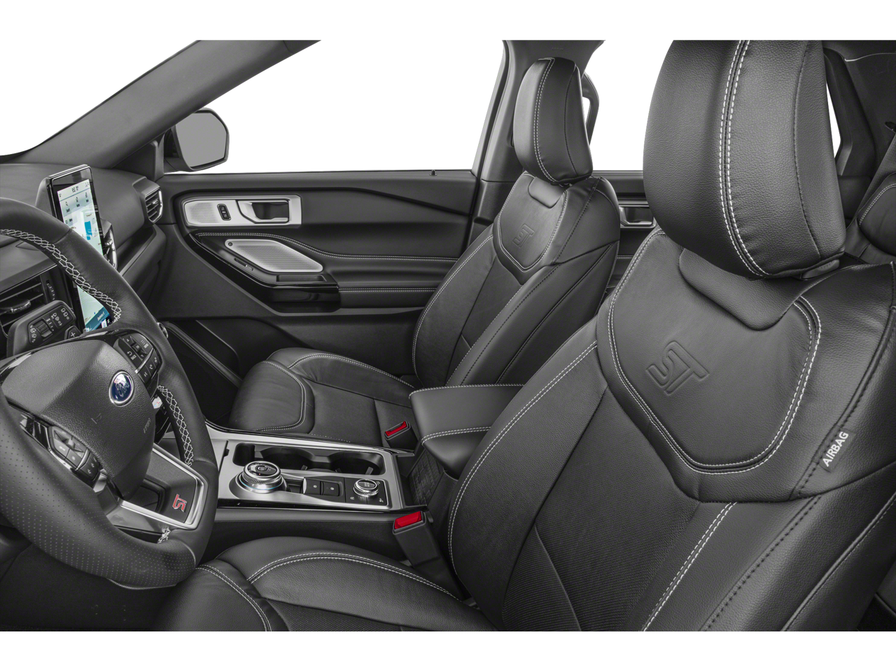 The exterior of the Explorer ST commands attention with its sleek Black finish, complemented by the stunning 21 Aluminum wheels and performance-inspired details. Step inside and you'll be enveloped in the luxurious cabin, featuring premium leather-trimmed, heated and ventilated sport captain's chairs, a heated steering wheel, and a premium Bang & Olufsen sound system.